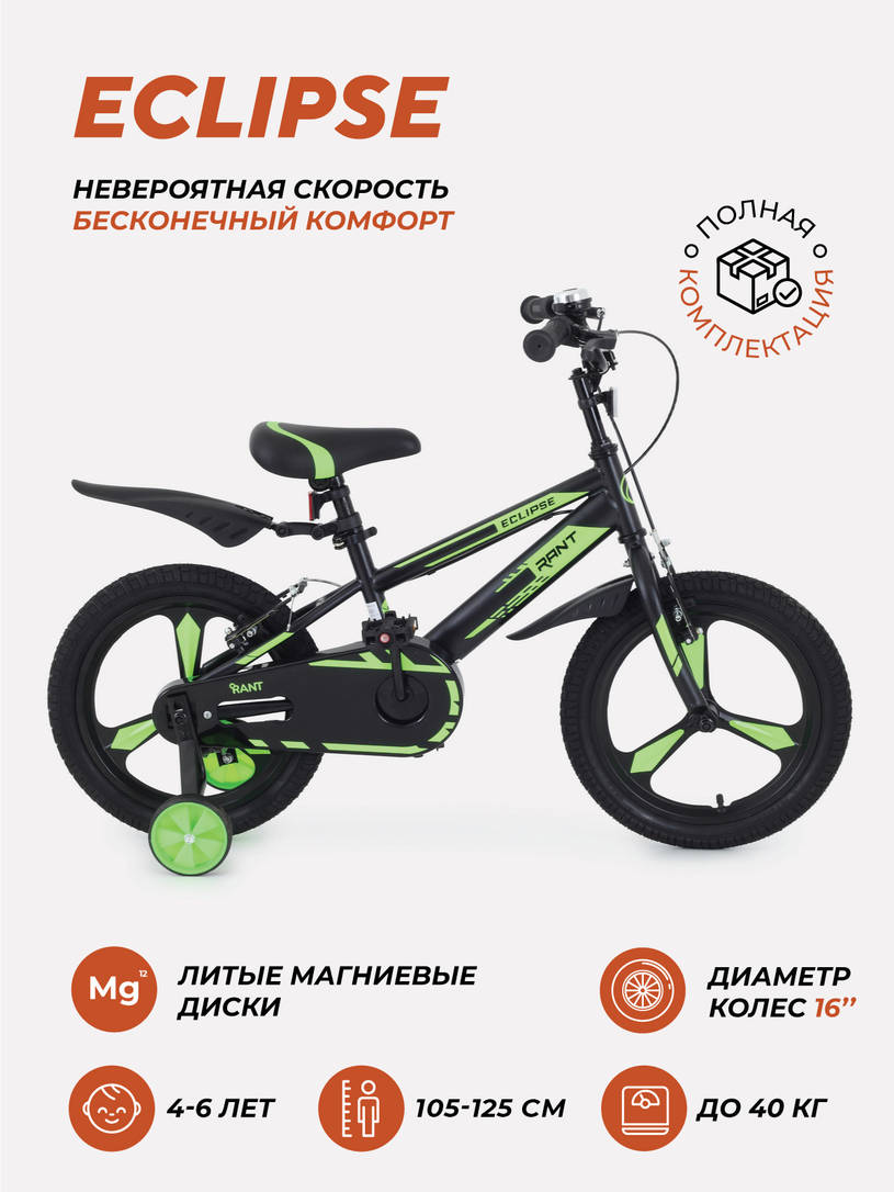 В интернет-магазине КОЛЯСКИ Вы можете купить велосипед 2-х колесный Rant Eclipse 16" черно-зеленый с доставкой по Москве и МО и Московской области, в другие города России, с официальной гарантией производителя. КОЛЯСКИ - Ваш Любимый Интернет-Магазин Низких Цен!