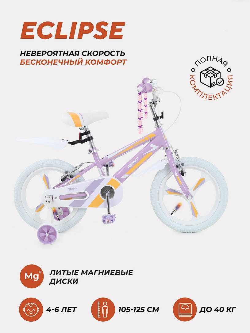 В интернет-магазине КОЛЯСКИ Вы можете купить велосипед 2-х колесный Rant Eclipse 16" сиреневый с доставкой по Москве и МО и Московской области, в другие города России, с официальной гарантией производителя. КОЛЯСКИ - Ваш Любимый Интернет-Магазин Низких Цен!